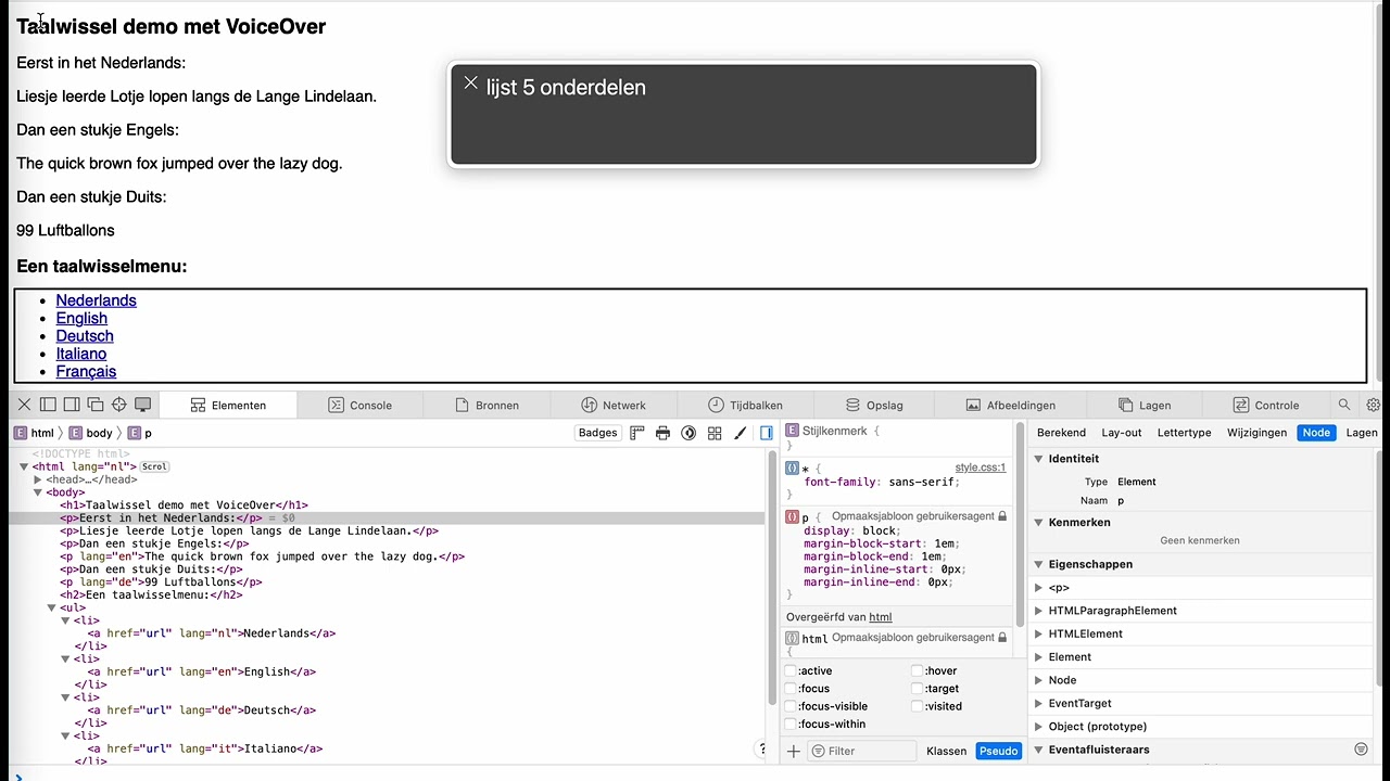 In deze video hoor je hoe de screenreader VoiceOver wisselt van stem en taal voor teksten waarvan de taal is ingesteld.